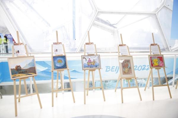 Paintings by autistic individuals are displayed at the National Aquatics Center in Beijing on March 31, 2024, during the venue's annual "Light It Up Blue" charity event. [Photo by Wu Xiaoshan/China.org.cn]