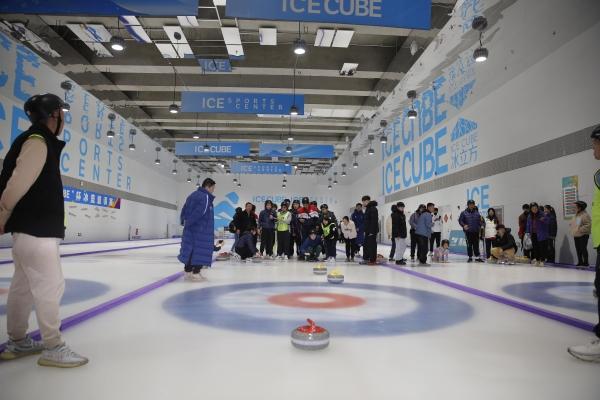Autistic children and their families participate in a curling experience session at the National Aquatics Center's underground ice sports arena on March 31, 2024. [Photo by Wu Xiaoshan/China.org.cn]