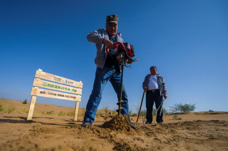 环交所与蚂蚁金服合作推出的支付宝个人碳账户“蚂蚁森林”项目,当地农民在“蚂蚁森林”公益林地上为种植沙柳钻孔。