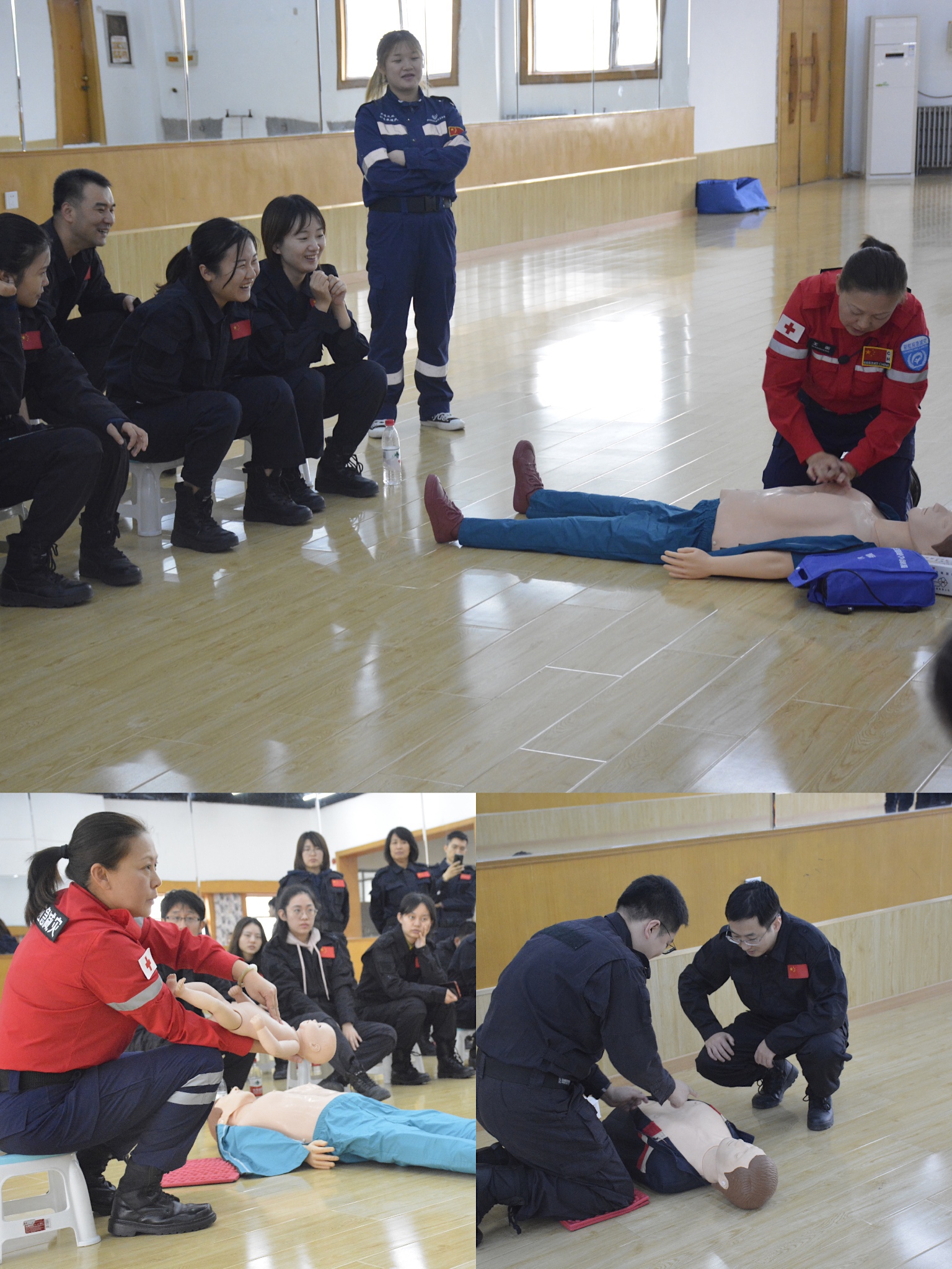 下午主要培训内容为应急救援。参训学员学习心肺复苏、呼吸道异物梗阻、创伤包扎技巧以及自动体外除颤仪的使用。每个学员均在模拟机上进行了心肺复苏技能考核,了解掌握不到位之处,加以改进。