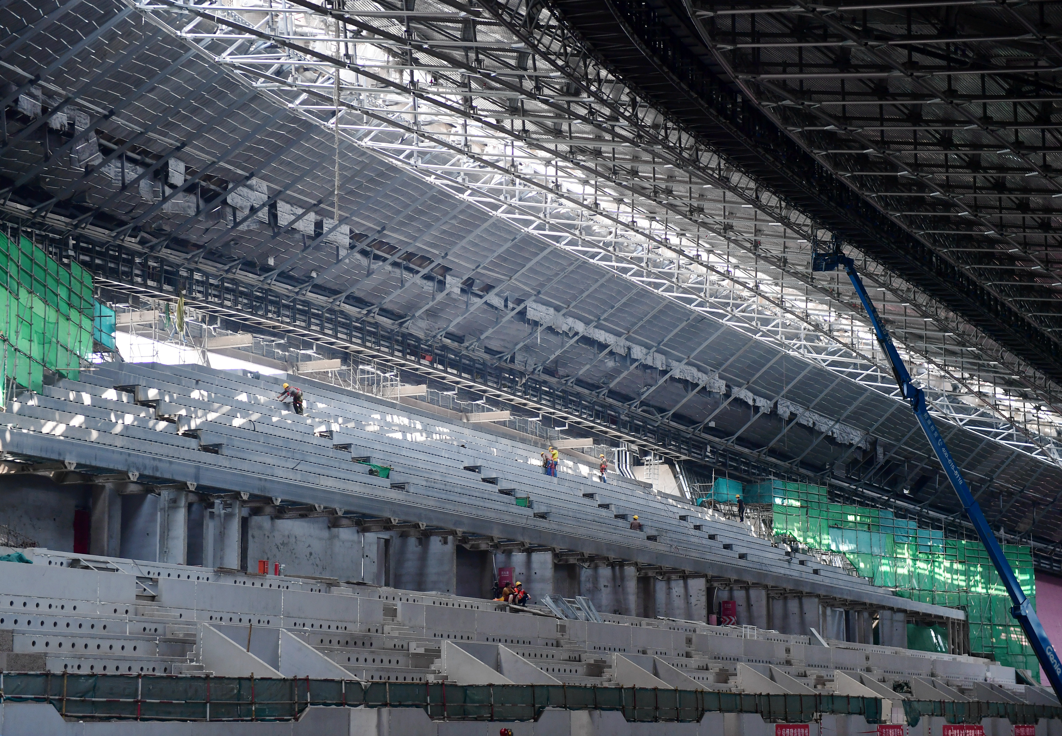 工人在首都体育馆内施工。新华社记者张晨霖摄