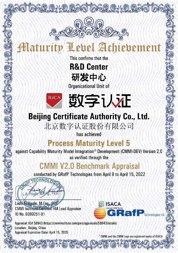 数字认证此次通过CMMI 5级评估认证,是公司在软件研发、应用开发等领域规范化管理、持续改进的重要里程碑,也是公司未来持续创新发展、为客户提供更加优质服务的新起点。未来,公司将继续发挥自身在技术、研发和管理方面的领先优势,把CMMI 5级评估认证标准充分融入到产品研发过程中,持续全面提升公司自主研发核心竞争力,输出优秀的产品和解决方案,提供高质量网络安全服务保障,助力北京科技创新中心建设,为中国网络信任与数字安全服务贡献更大的力量。