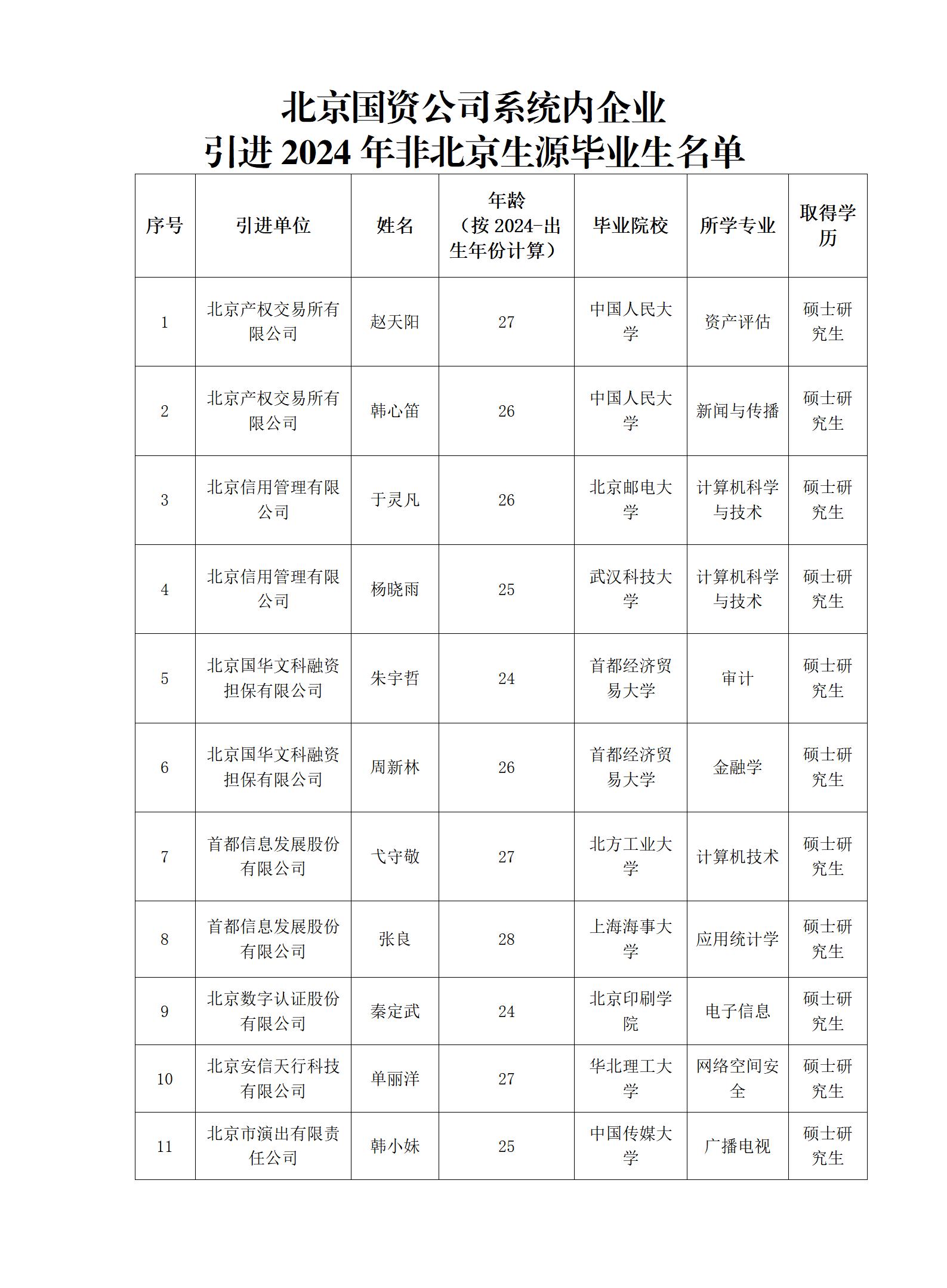 为加强毕业生接收工作社会监督,现将我公司系统内企业引进2024年非北京生源毕业生予以公示。