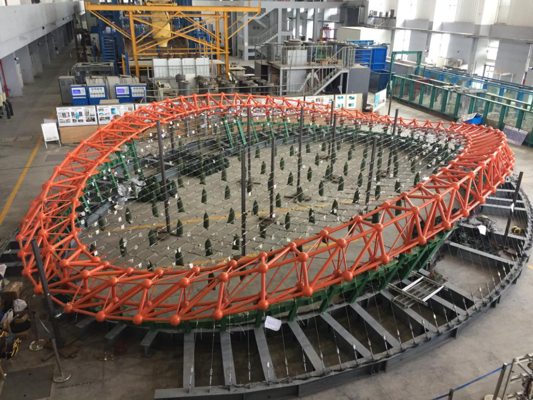 在推动高端材料国产化情怀的驱使下,建设团队拿出当年攻克“鸟巢”国产Q460钢材时的气魄,把国内能够生产高钒密闭索的顶级厂家全部考察了个遍。同时,与浙江大学开展联合攻关,在实验室里搭建起一座几何相似比为1:12的“迷你骨架”,从施工可行性到受力性能对设计成果进行了全方位反复验证国产索的安全性和可靠性。从2018年10月21日第一车高钒密闭索运入施工现场,到2019年3月19日索网张拉完成,敢为人先的担当和尝试使国产高钒密闭索在国内大型场馆中成功首次应用,填补了国内技术空白。