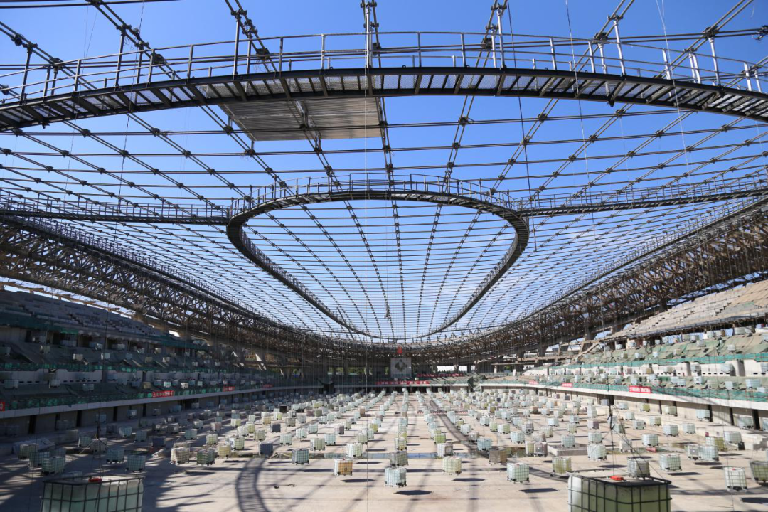 由于工期紧,为解决好混凝土结构施工与钢结构环桁架拼装的矛盾,建设团队采取了屋面环桁架“南北分区直接吊装+东西两侧滑移安装”的施工方法,使主场馆地上混凝土结构施工与东西侧钢桁架拼装同步进行,钢结构与混凝土结构同步平行施工。东西两侧环桁架长181.9米、重5500吨,东西两侧滑移安装采用由地面滑移到高空滑移,这在国内尚属首创。