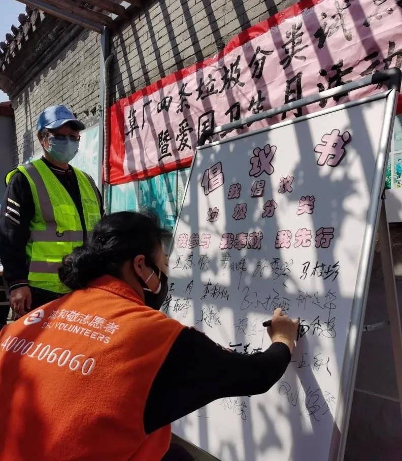 早在《管理条例》正式实施前,东城区草厂驿站就积极展开行动,携手社区共同推广垃圾分类宣传活动。驿站的工作人员积极响应号召,在活动现场为居民讲解垃圾分类相关知识,发放宣传材料,并在承诺书上签下了自己的名字,帮助社区做好垃圾分类的宣传工作,积极倡导社区居民发扬主人翁精神,让垃圾分类理念深入人心。