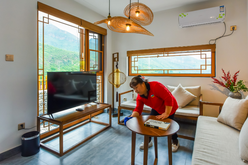 Beijing City is now in the height of summer. But the pleasantly cool mountain breeze is blowing in Liangjiazhuang Village, which is located in remote mountain. Walking into the courtyards of guesthouse transformed from idle old houses, people can listen to the melodious sound of wind-bells. Three housekeepers are busy cleaning up every corner of the courtyard.