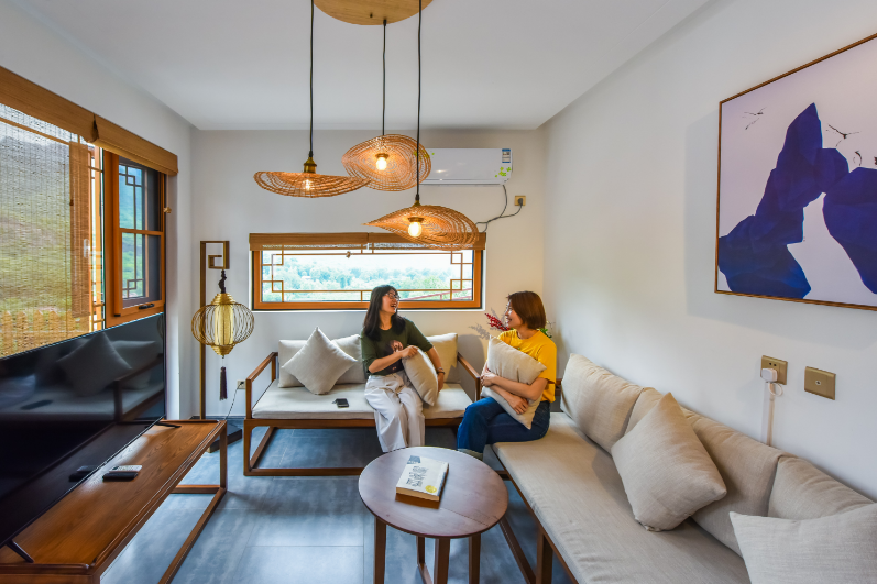 The sunlight penetrates through the large French doors and windows. Room layout is elegant and comfortable. Classical and simple Chinese-style furniture is displayed in the spacious kitchen and living room. Both guesthouses take on poetic names, respectively: One is called “Guan Lan Shan Ju”, and the other is called “Qi Yin Shan Fang”.
