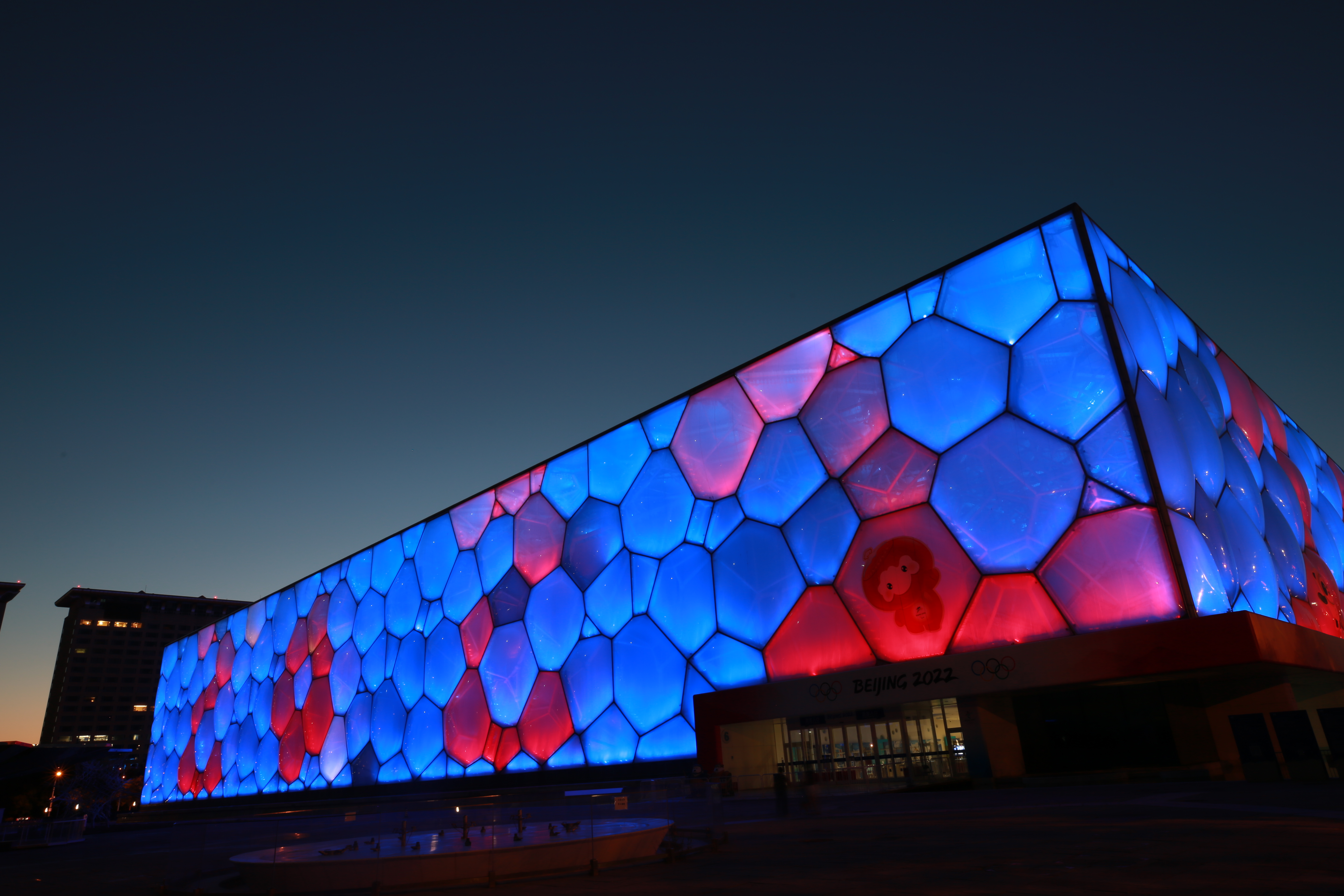 The National Aquatics Center lights up on June 23, 2022, to celebrate this year's International Olympic Day. [Photo by Wu Xiaoshan/China.org.cn]