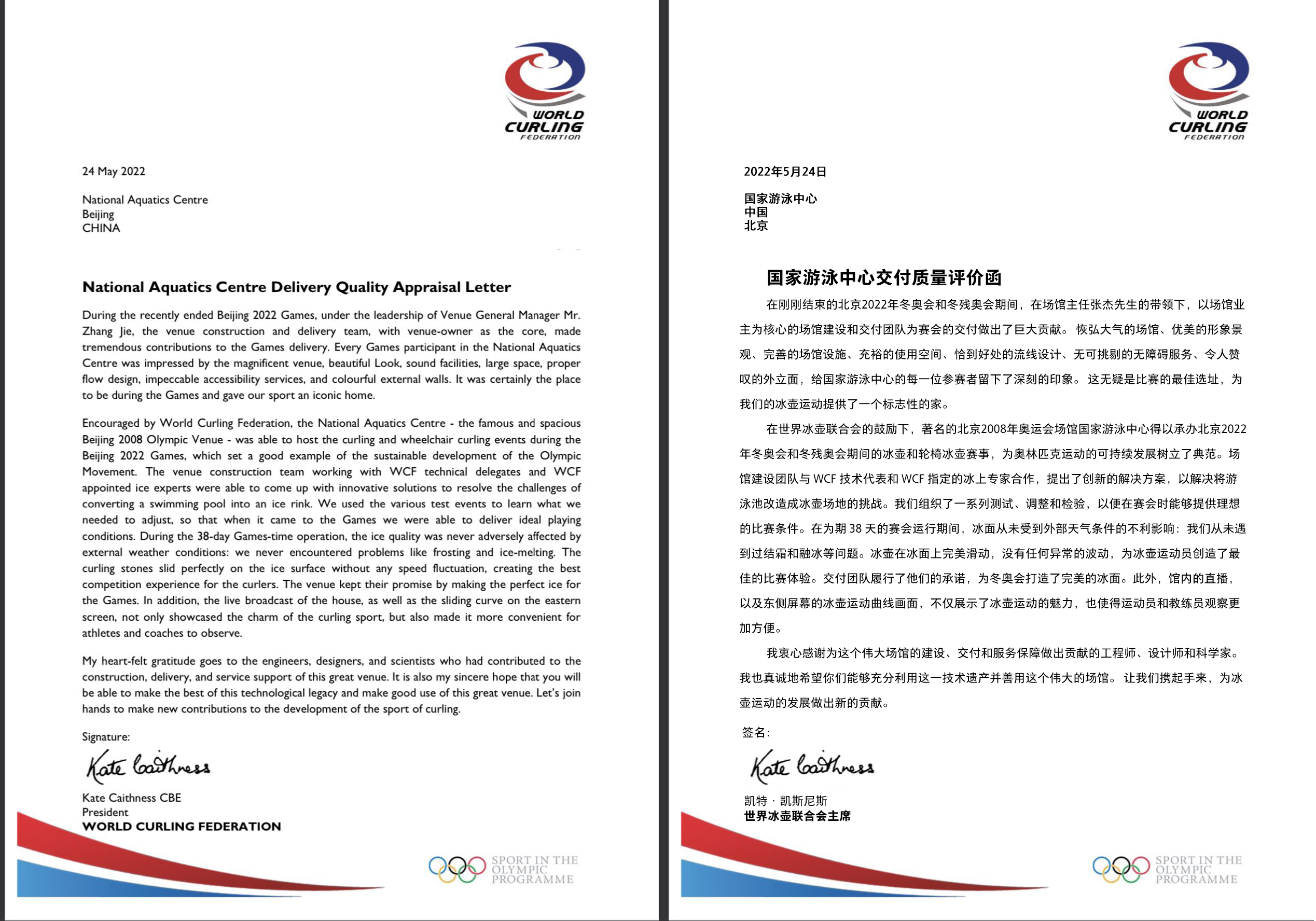 5月24日,国家游泳中心收到世界冰壶联合会主席凯特•凯斯尼斯发来《国家游泳中心交付质量评价函》,高度...