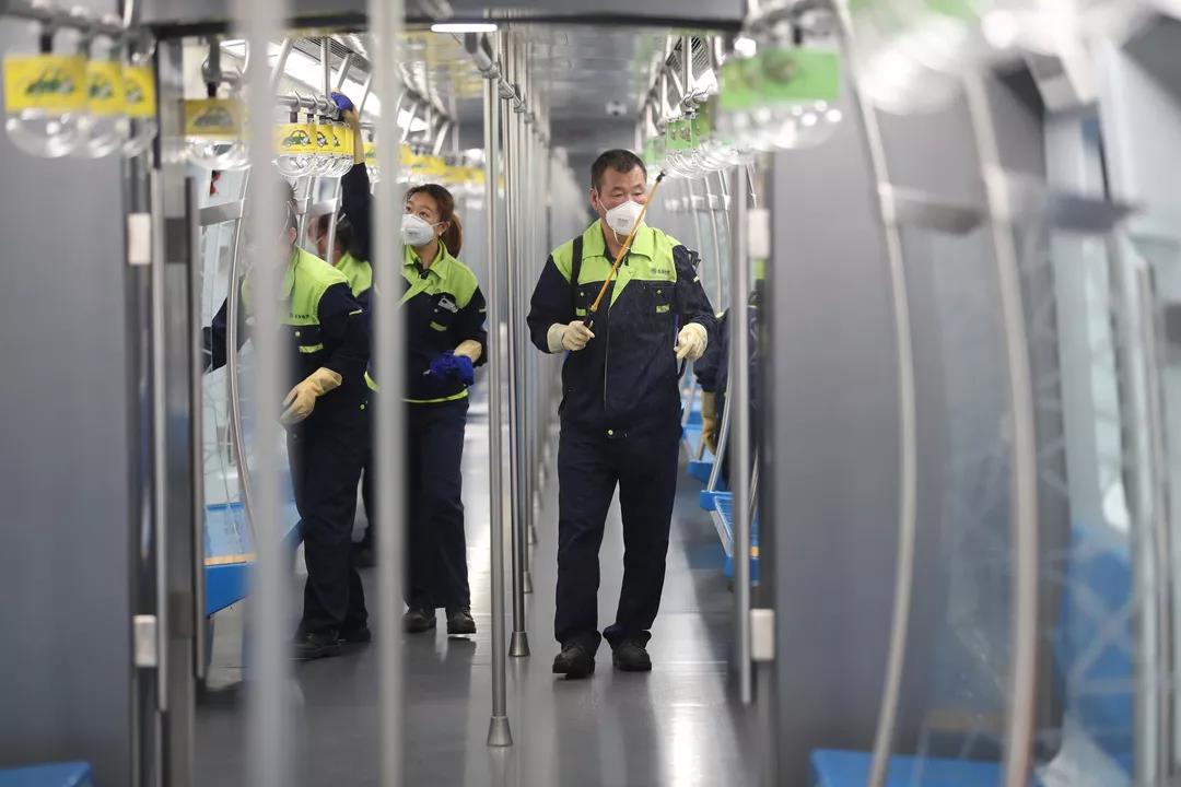 北京地铁“无死角”消毒,全网车站测温进站,列车四次消毒方可出库。