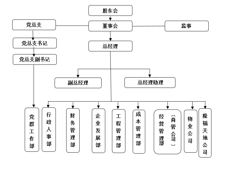 新隆福公司下设7个部门,分别为党群工作部、行政人事部、财务管理部、企业发展部、工程管理部、成本管理部及经营管理部;下设3子公司,分别为隆福物业公司、隆福商管公司、隆福天地公司,其中经营管理部与隆福商管公司合署办公。