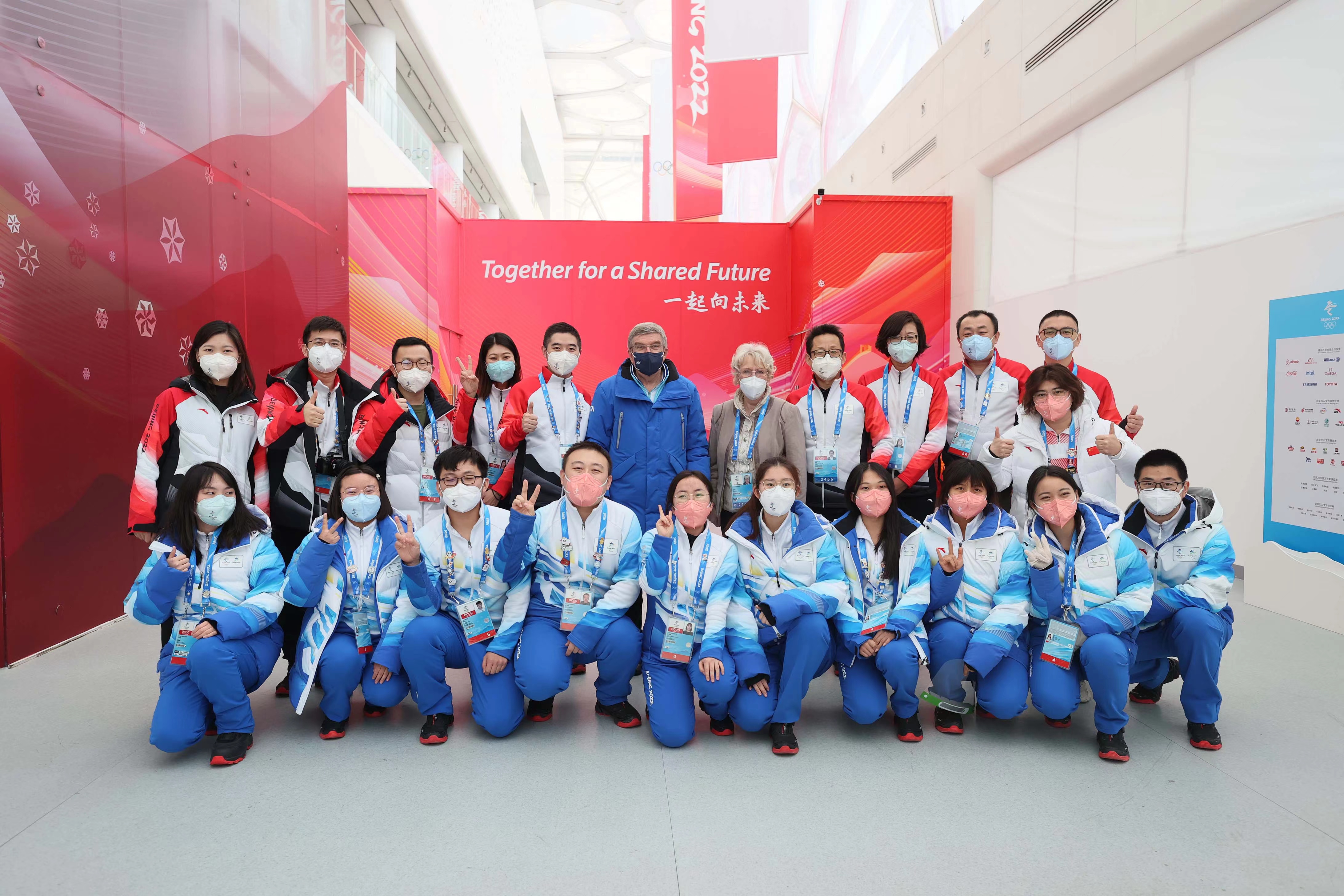 图说:国际奥委会主席托马斯·巴赫、世界壶联主席凯特·凯斯尼斯与国家游泳中心场馆运行团队工作人员合影