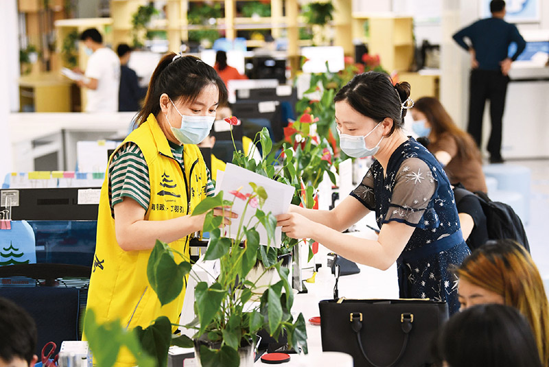 营商环境是企业生存发展的土壤。图为2022年6月15日,贵州省贵阳市南明区政务服务大厅法人服务区的工作人员在给企业人员讲解减税降费优惠政策。
