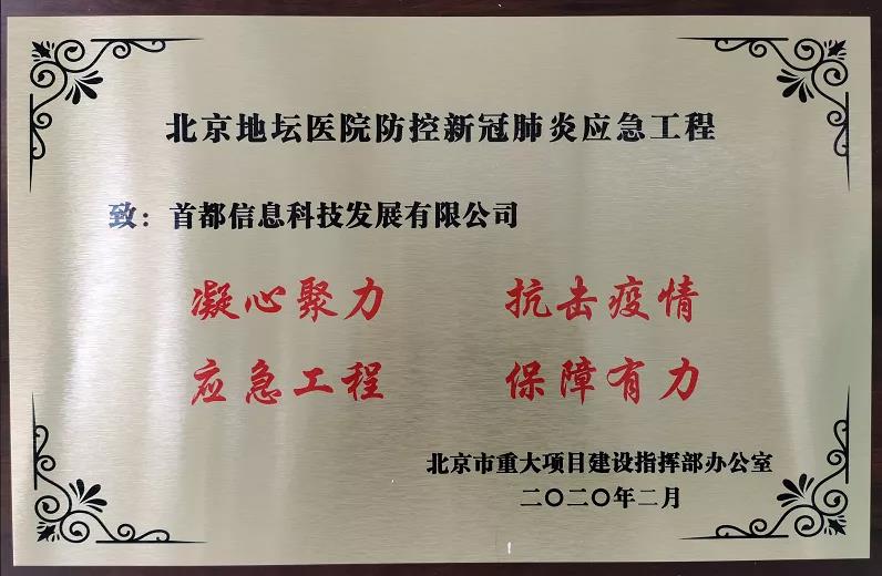 近日,市防控新冠肺炎应急工程指挥部(市重大办)向电影天堂 所属首都信息公司颁发了一块沉甸甸的奖牌,以这十六个字的高度评价,对所属首信科技公司在北京地坛医院防控新冠肺炎应急工程中的出色表现给予表彰。