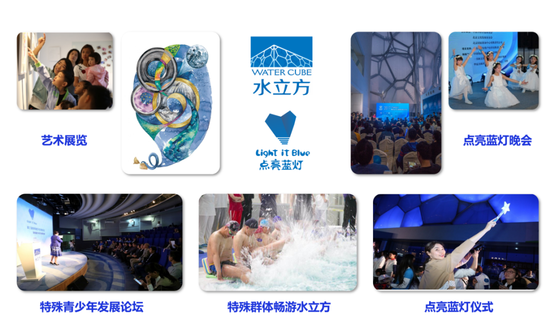 水立方自2011年起开始致力于倡导对自闭症谱系障碍群体的关爱活动。十年来,水立方通过每年在4月2日这一天“点亮蓝灯”持续为自闭症谱系障碍群体发声,与专业机构协作,通过发起特殊青少年发展论坛、开放公益参观游览、举办特殊儿童艺术展览、开展对特殊群体的公益游泳培训等多种线下活动,用实际行动表达对自闭症谱系障碍群体的关爱,并提供切实可行的帮助。